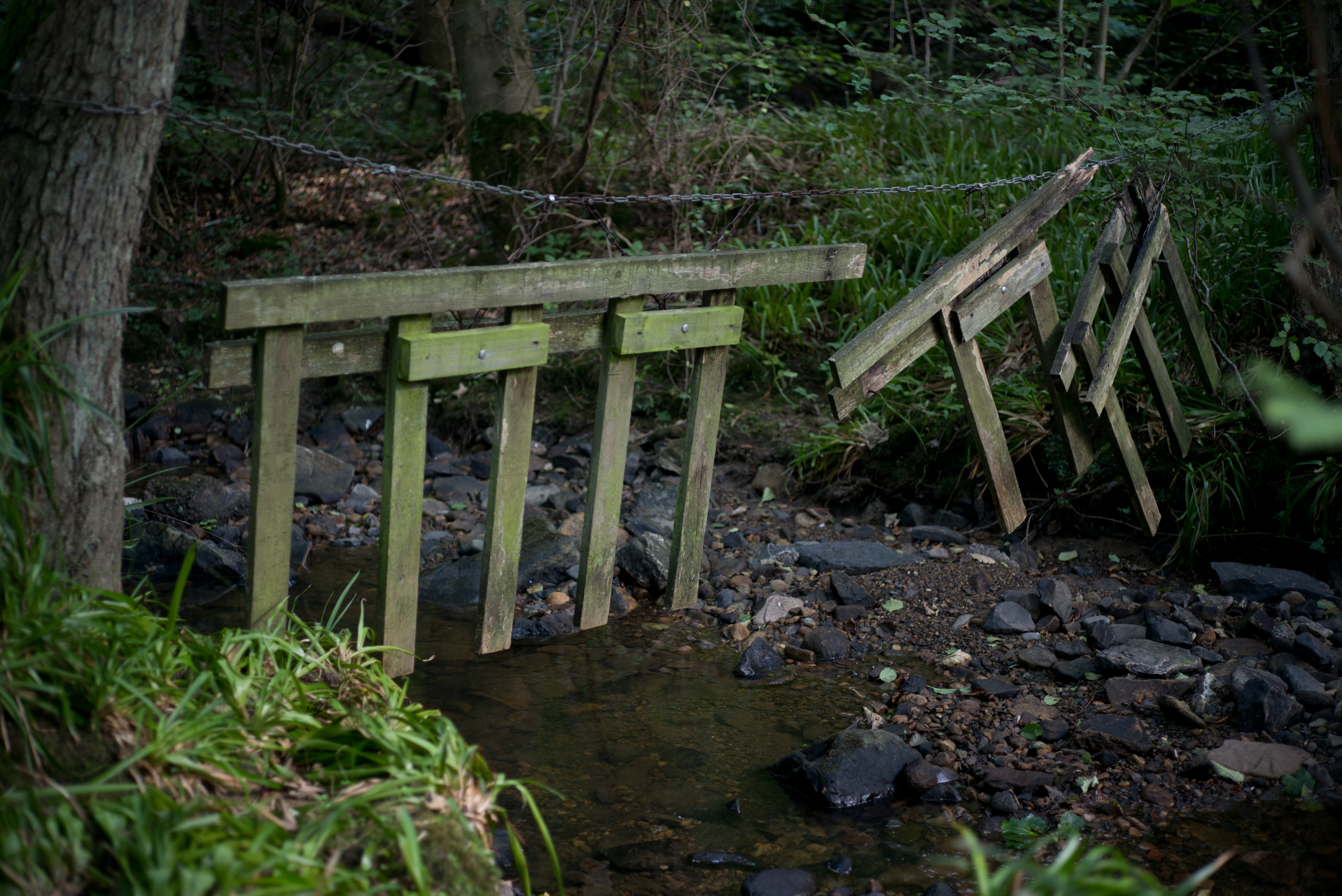 Quite fortuitously this drop gate echoes that in Cotman’s painting in that it is in two main parts, one of which is hanging at an angle. In contrast to the painting though I have adopted a landscape rather than portrait format. Partly this is a matter of pragmatism: it would have been physically difficult to get into a position that would have offered a similar view to Cotman’s and give a portrait view. In addition, in Cotman’s painting there is more open land in the background. Here is quite wooded at sits at the bottom of quite a steep slope in the background so there is no similar sense of openness denied. I therefore decided to focus more directly simply on the physicality of the barrier. That was in turn aided, quite by chance, by the light conditions – this bit of the burn is heavily shaded – which meant that in order to achieve a shutter speed of at least 1/60s, as I did not have a tripod with me at the time, I had to use a very shallow depth of field – f/1.7, which is close to the minimum achievable on this particular camera, a Leica M with a Summicron f/1.2 50mm lens.