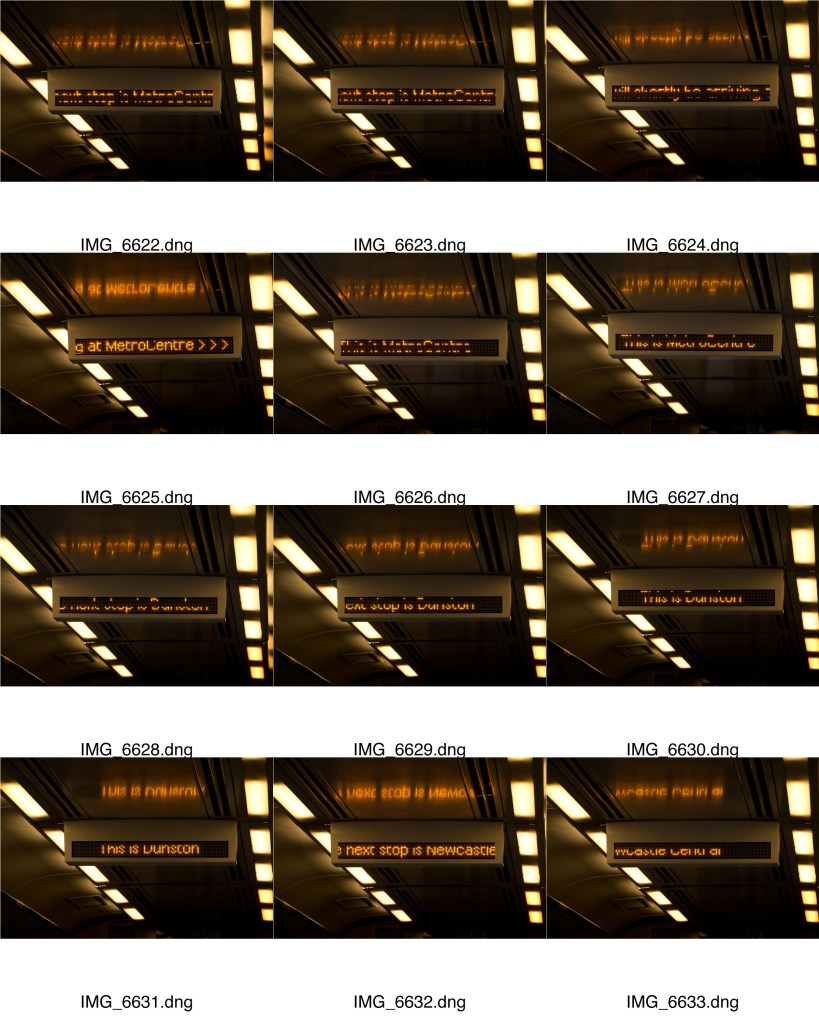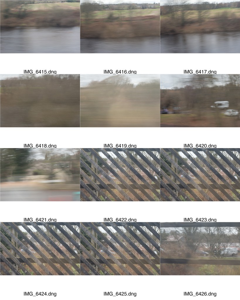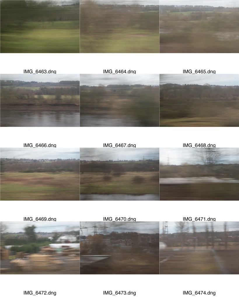The last set was very much based on the visual experience of being on the train and experiencing the journey through the window, observing the landscape as the train passed through it. For an alternative approach I have put together a more varied set describing the journey itself, from boarding the train to getting off, as a more abstract experience. A number of images have been carried over from the previous set. Some have come from the attempt at a text based set. I have though added a few new ones from the first shoot. Again, I have tried to highlight the contrast between country and town, this time adding a bit more emphasis on the build up of residential areas as the train comes into town. I have also hinted at the presence of other train traffic as one approaches Newcastle: the ante-penultimate image is of another train crossing the King Edward VII bridge into Newcastle.