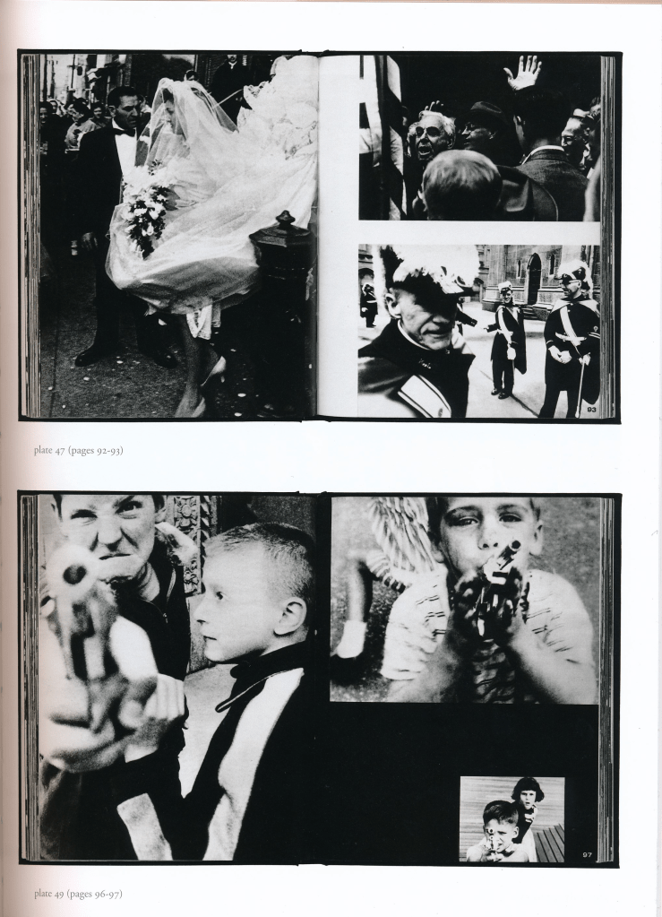 Klein’s book (2016) is one of the very few that I have come across that seem to me to show that street photography can approach the picturing of a physical landscape without depicting its topography in a literal, conventional “landscape photography” way. His approach is various, eclectic, sometimes apparently chaotic. The editing and arrangement of the images across the physical pages of the book are unconventional and often visually jarring. It sometimes reminds me of the “jump-cut” approach to editing used by French Nouvelle Vague film directors, particularly the sequence in Jean-Luc Goddard’s “A bout de souffle” in which Jean-Paul Belmondo and Jean Seberg drive around central Paris: the editing flits about from place to place in a non-linear manner but nevertheless conveys a sense of Paris itself. In Klein’s work we see people, snatches of places and locations, rarely, but not without exception, easily identifiable, signs, adverts, all sorts of symbols of an idea of the city. Occasionally it falls into Sontag’s flâneur trap, wallowing in the seedier sides of life, but nevertheless the cumulative effect is to give an impression of the city as a physical, geographical, place. In his article included in the 2016 ‘Books on Books’ edition of the book, Max Kozloff comments (unhelpfully, the pages of the commentary section of the book are not numbered):