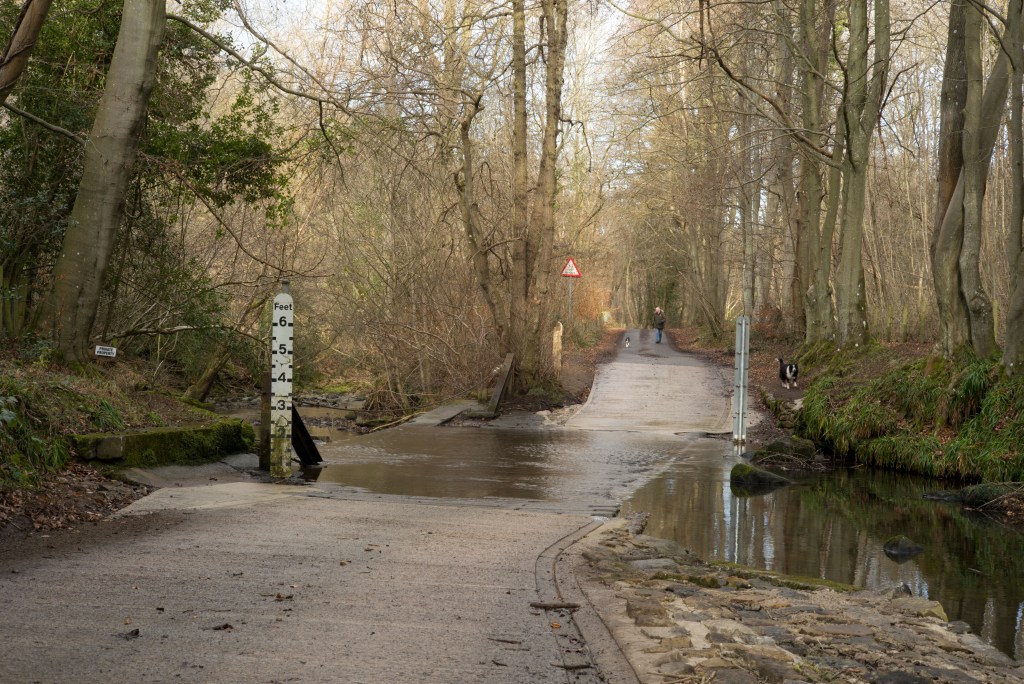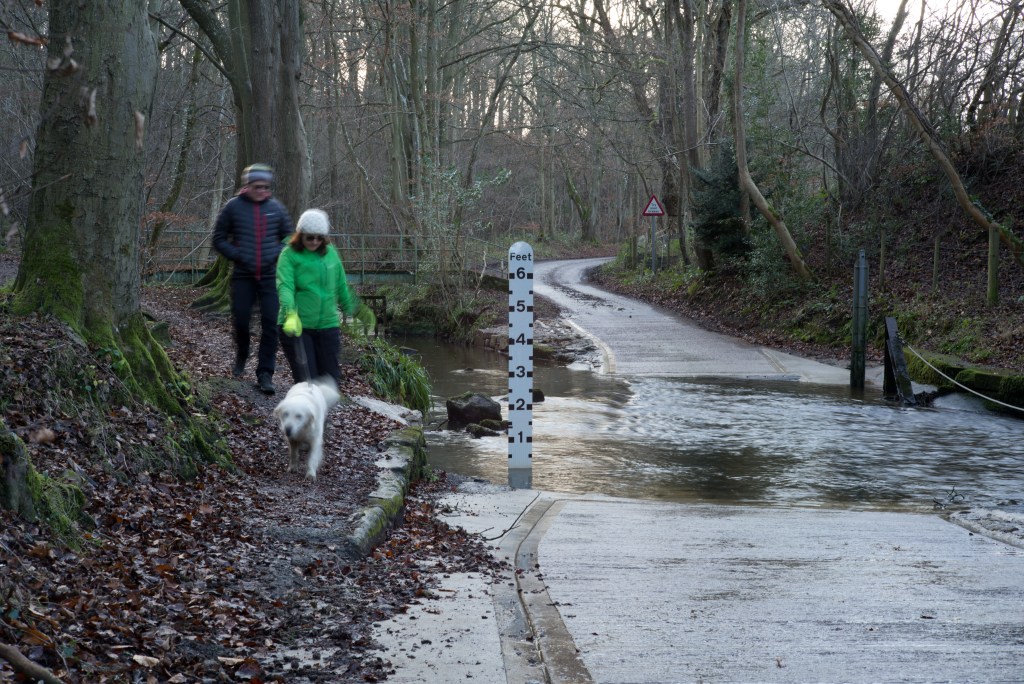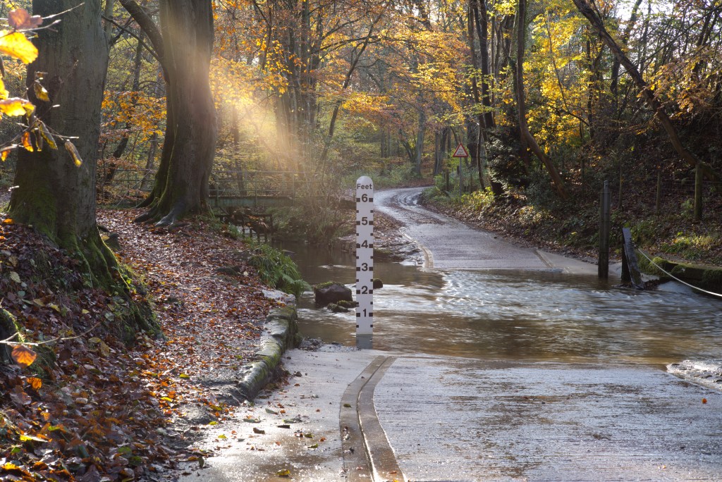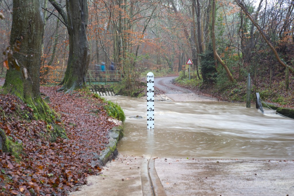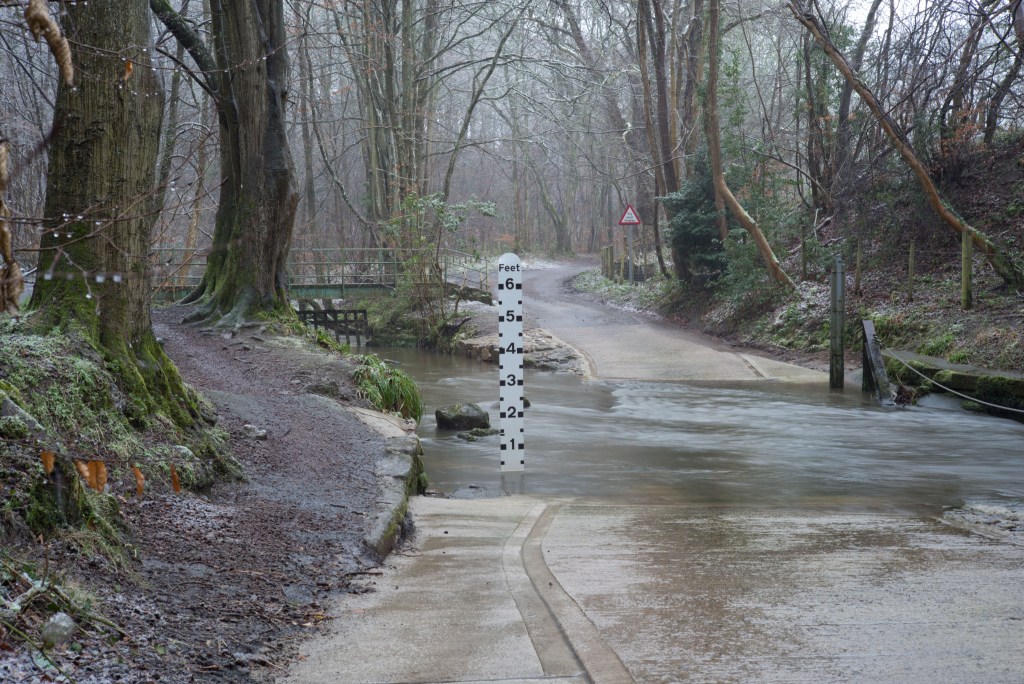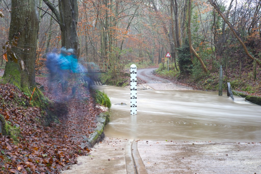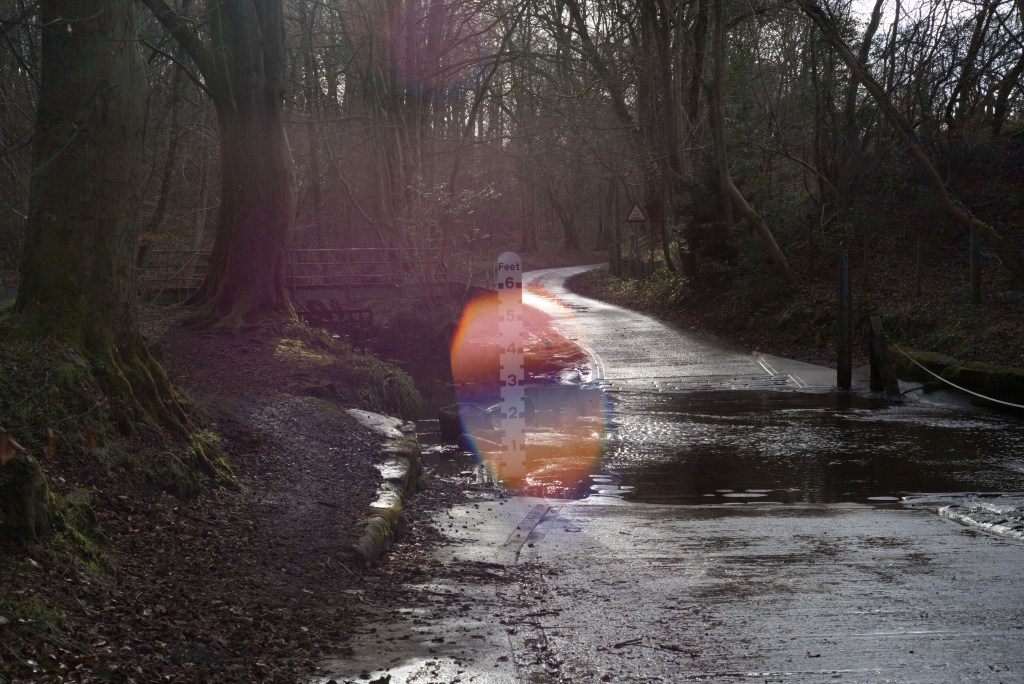 I have at last made a start shooting for this exercise. For now I have shot only the ford and will follow up with the fall back plans (on which I have had some more thought) later. I made a start now, despite the fact that the weather was quite bad today, to take advantage of the significant flow of water through the ford as a result of very heavy rain overnight. Despite the volume of rain over the last couple of weeks the water level had fallen back to just a couple of inches by yesterday. Today, on the upstream side, the water was almost two feet deep.