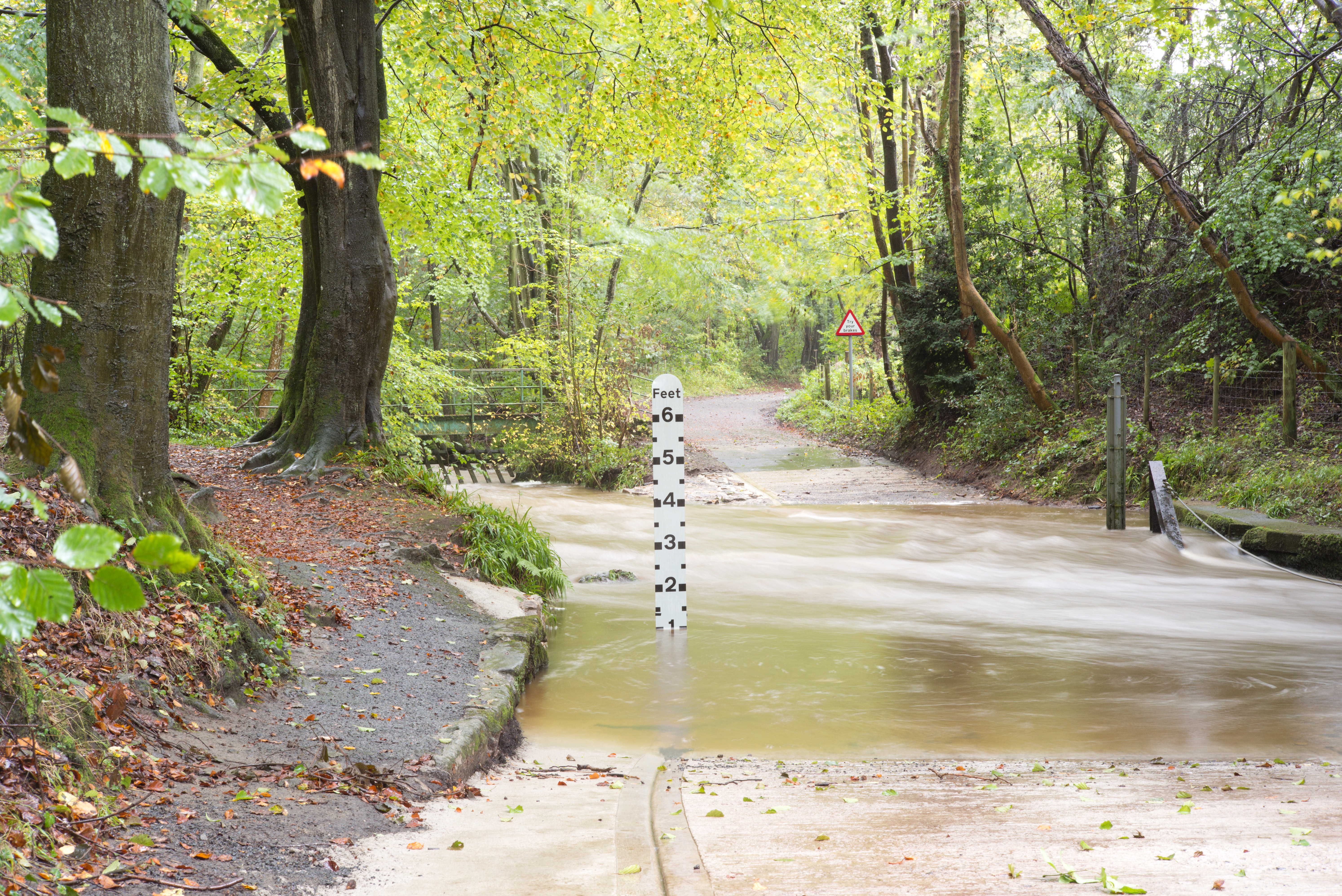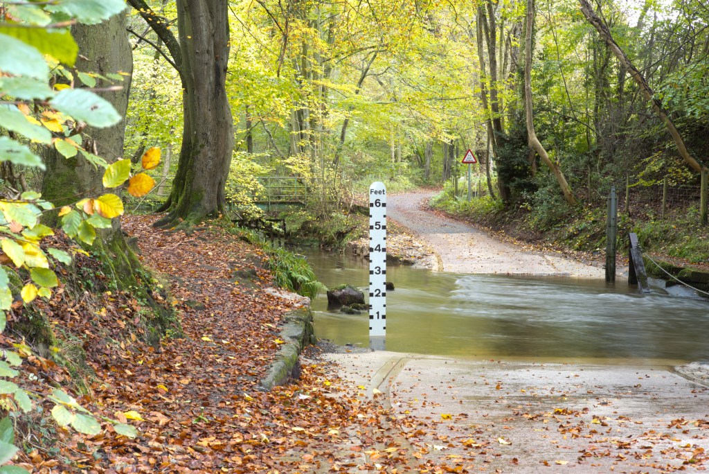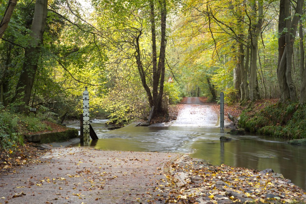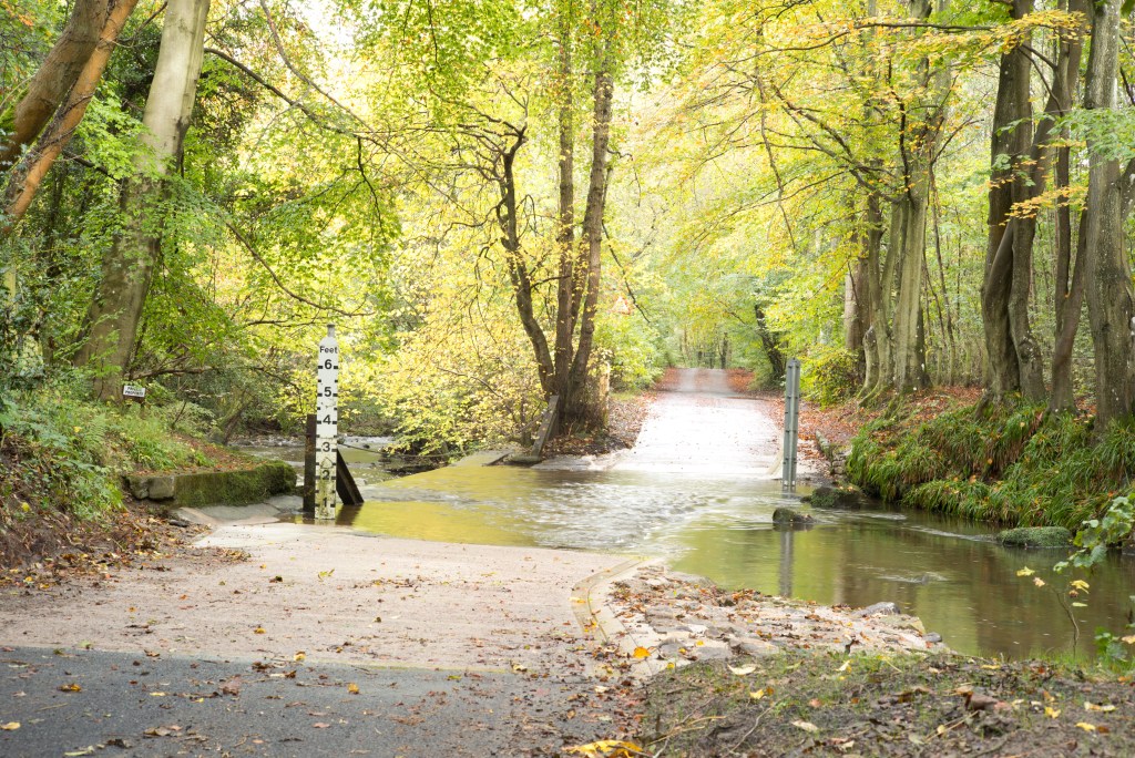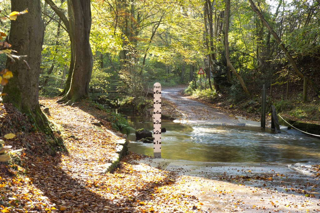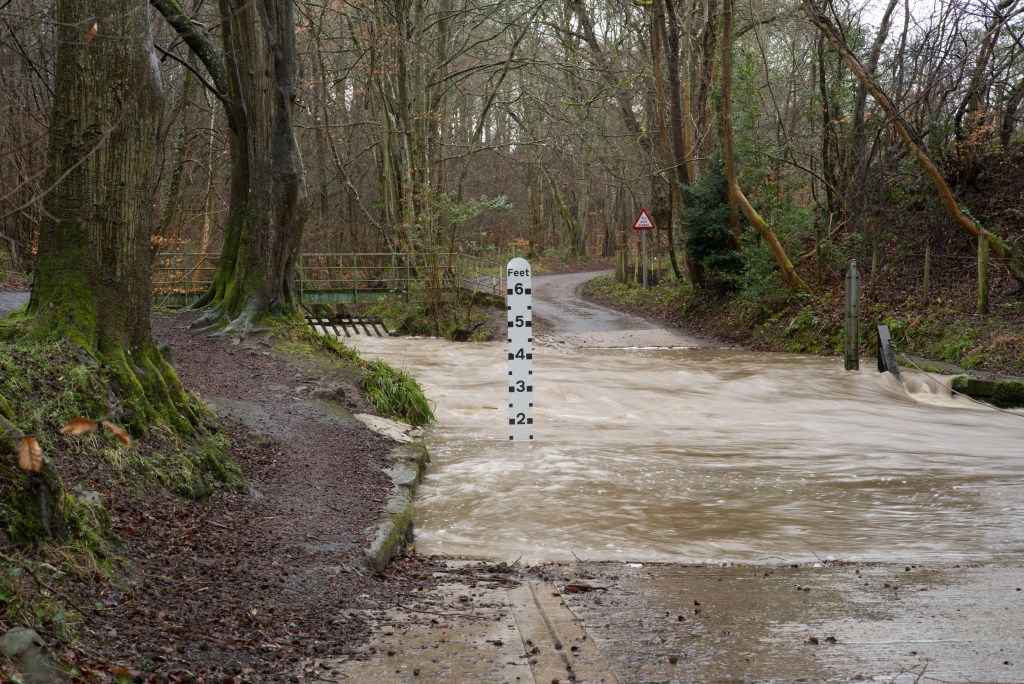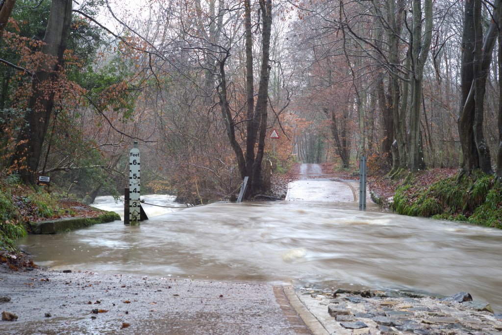 I have at last made a start shooting for this exercise. For now I have shot only the ford and will follow up with the fall back plans (on which I have had some more thought) later. I made a start now, despite the fact that the weather was quite bad today, to take advantage of the significant flow of water through the ford as a result of very heavy rain overnight. Despite the volume of rain over the last couple of weeks the water level had fallen back to just a couple of inches by yesterday. Today, on the upstream side, the water was almost two feet deep.