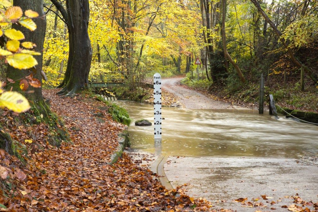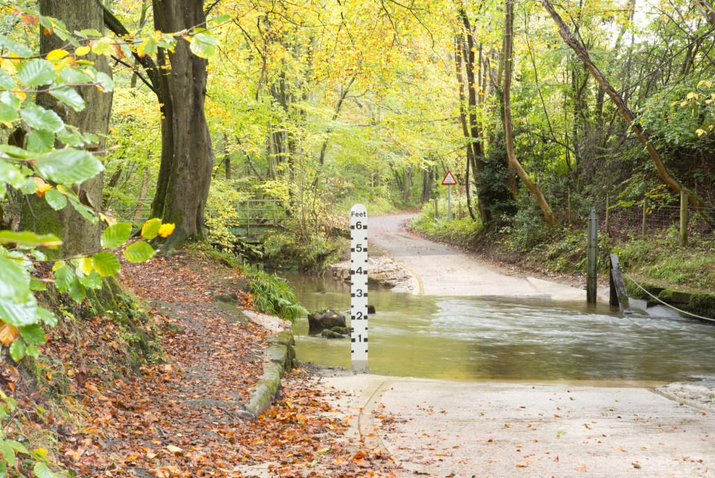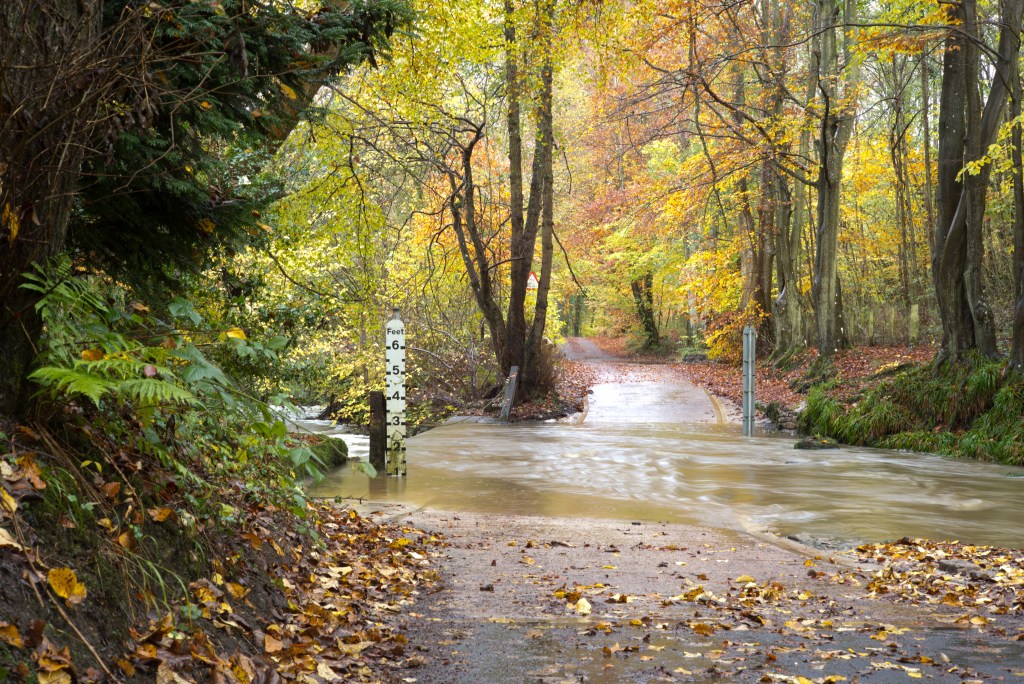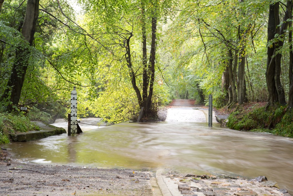 Note there are only a couple of inches of water in the ford. Compared with today, less than 24 hours later, almost two feet deep on the upstream side: