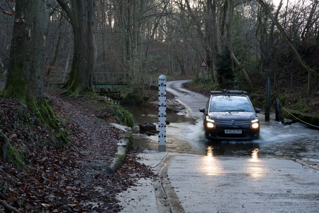 Following my last brief post on this project, and my tutor’s comments about the possibility of including people and cars, as luck would have it the ford today turned out to be quite busy. While I was there a couple came through with their dog, whom I caught with less blur this time as the light was better (it was not raining today) so my shutter speed was a bit faster. There were three cars that came through quite close to each other. One came through while I was setting up, another while I was moving from one side of the ford to the other, but one dropped, as it were, right into my lap.